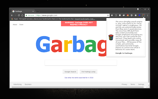 This "item" is an extension that alters the DOM of some Google-owned sites. When browsed to, a message will pop up stating that your privacy is owned by Google, and a few Google-specific words have been changed around all for good fun. This is my very first attempt at creating an extension and decided it was going to poke fun at how much I dislike the company and all of it's worthless, outdated, mediocre products that have slowly seeped their slimy way into my everyday life.