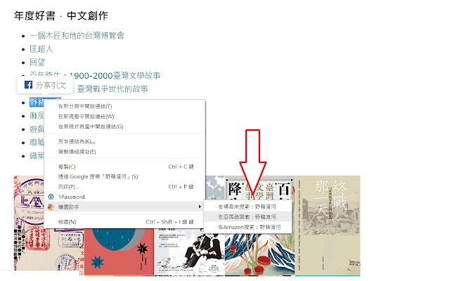 本插件能快速搜索博客來書店、亞馬遜中國和亞馬遜美國的圖書資料。並能將感興趣圖書資料複製到剪貼板。