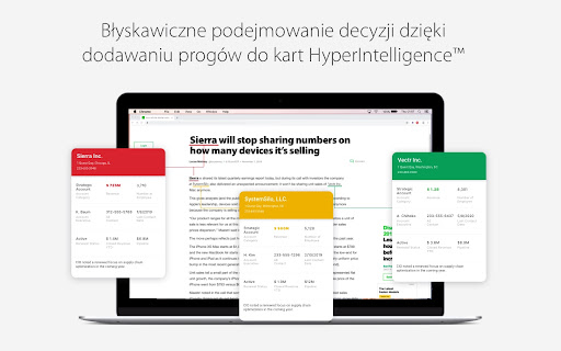 Dzięki HyperIntelligence firmy mogą wprowadzać bezobsługowe rozwiązania Zero-Click Intelligence dotyczące klientów, produktów, osób itp. bezpośrednio do poszczególnych słów na dowolnej stronie lub w dowolnej aplikacji internetowej. To rozszerzenie, opracowane przez Strategy — światowego lidera w zakresie analityki i mobilności biznesowej — wyświetla informacje z ponad 200 źródeł danych biznesowych i pozwala na uzyskiwanie kontekstowych informacji w czasie rzeczywistym bezpośrednio podczas używania przeglądarki.