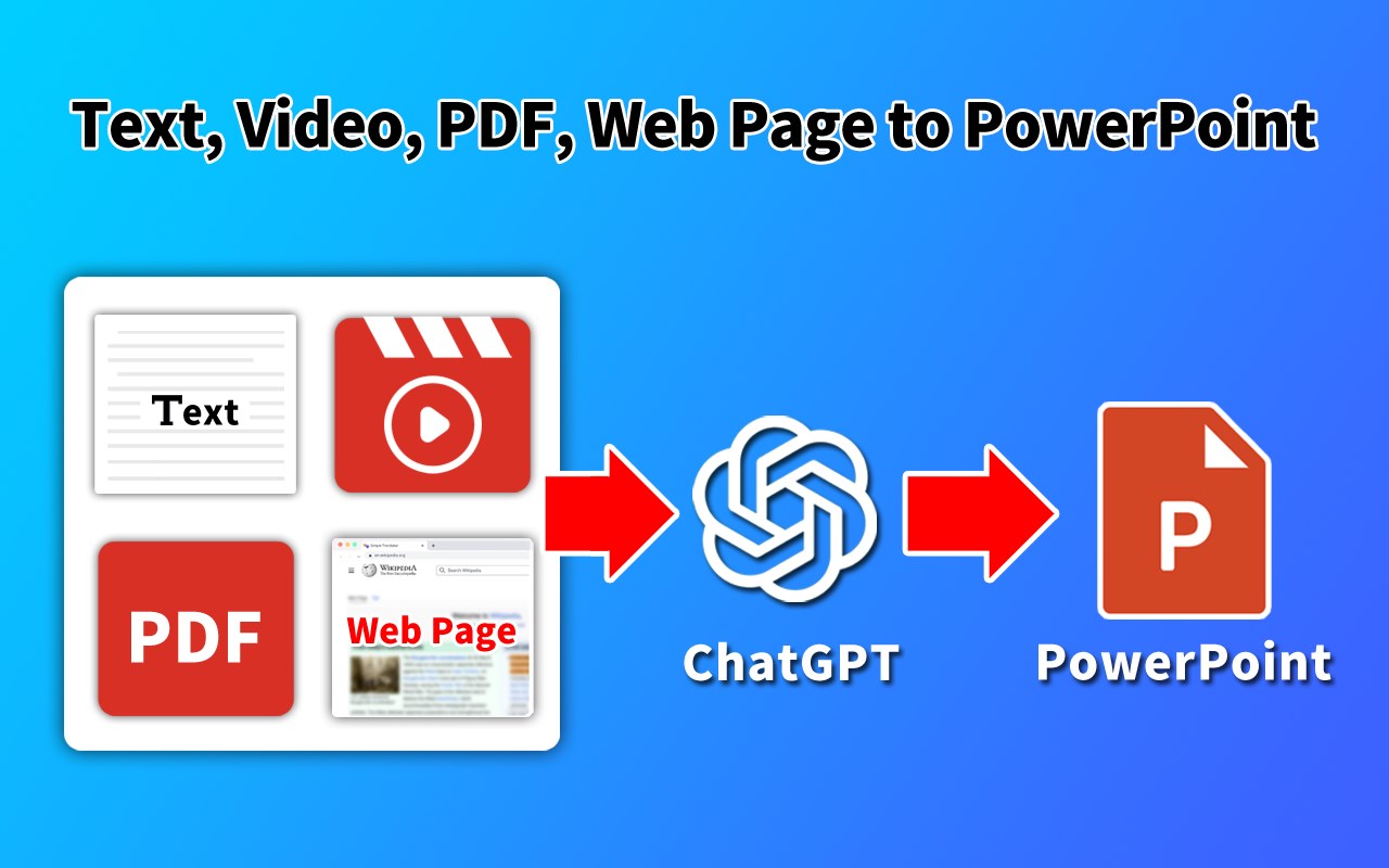 Use our AI models (ChatGPT, Openai, Bard, Claude, Llama) to summarize text descriptions, videos, PDFs, web content, Extract key points, and then generate PowerPoint according to your requirements.